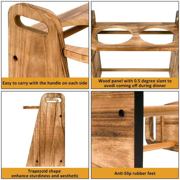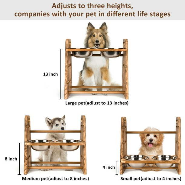 Torched craft only, no any paint, no any odd smell, natural wood grain makes friendly feeling, helps your pets more easily get close and used to it. Trapezoid feeder with two round wood supporting rods strengthens sturdiness, attractive modeling of raised dog feeder. Overall size l 16.7x w 8.6 x h 15.5 inches. The dog raised bowl has 3 adjustable heights, 4', 8' and 13', it is suitable for different breeds of dogs of various heights, meanwhile, the raised feeder will also help improve our pet's posture while they are eating, reducing the strain on their joints and also promotes digestion, reducing bloating and neck strain while feeding.