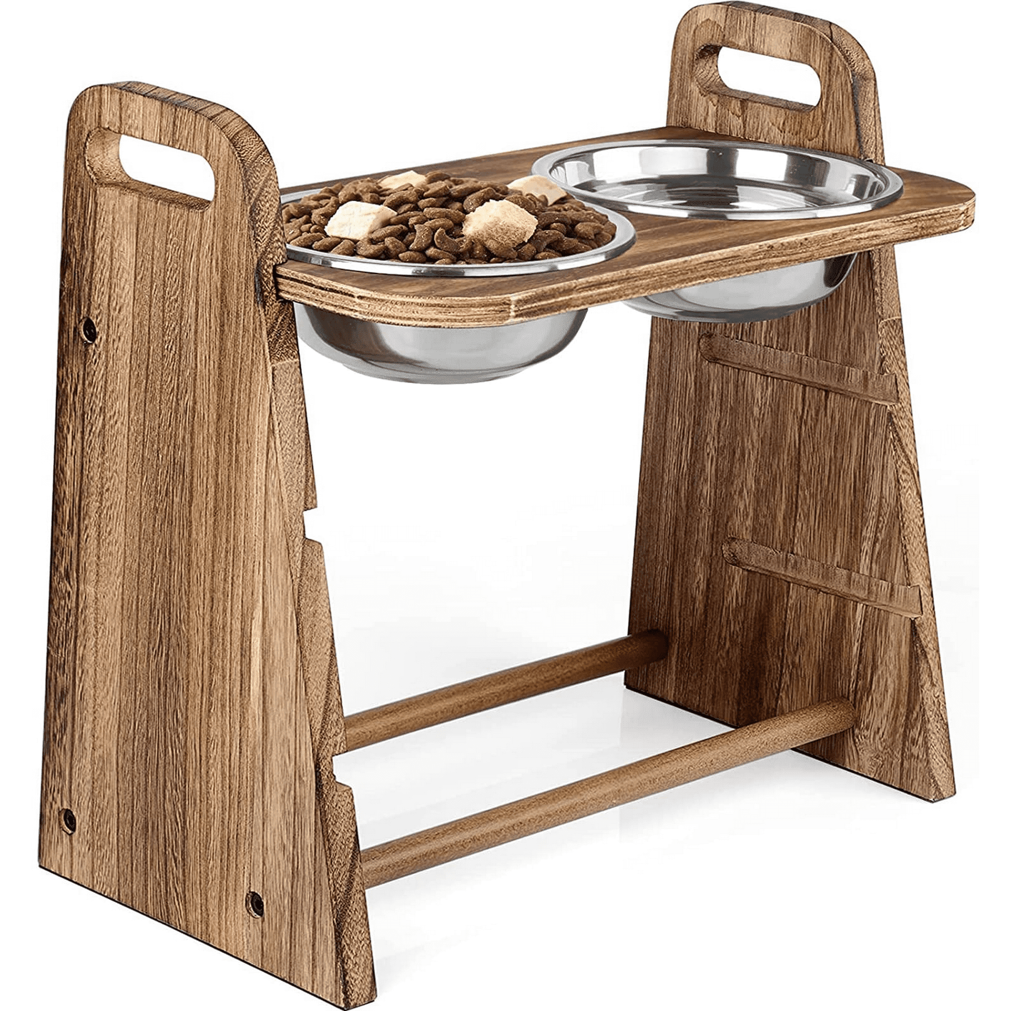 Double 1500ML large capacity stainless steel bowl provides a completely sanitary eating surface and is dishwasher safe for easy care and cleaning. Bowls are removable for easily cleaning and refilling. Each bowl opening diameter with rim 7.5 inches, 5.8 inches bottom dia. And 2.8 inches height. The 1.5L dog bowls can meet pets' daily diet and water needs.Adjustable stand with three heights can be set to three different heights to cover different growth stages of your furry pals. Proper position helps preventing gastric upset and relieves neck and back strain in aging or injured pups. Each height of adjusted elevation off floor is 4 inches, 8 inches and 13 inches, it's your best choice for your pet's feeding time.Natural solid wood elegant elevated pet feeder features rustic finishing with gorgeous wood grain, trapezoid shaped, the solid non-slip base ensures that the bowls stay firmly in place. Engineered for style and durability, this classic design will complement any home decor.Easy adjustment and installation customizable three heights to be achieved by only sliding wood panel to different notches. Comes with cut-out handle on each side panel for easy carrying. Just need put all wood panels together by tightening screws into pre-inserted threaded rods.It comes with required hardware and clear instruction for quick installation. Exquisite and safe packaging that helps ensure safe delivery. For good maintenance, please wipe off water and food residue with a cloth after each use.