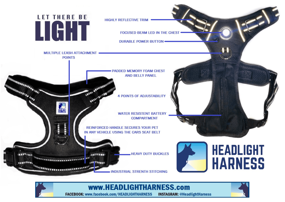 The Headlight Harness provides superior lighting both for you and those in your immediate surroundings. Highly Reflective; Water Resistant; and Light Weight; the Headlight Harness is the only dog harness you will ever need. The Integrated; Focused Beam LED in the chest projects light up to 100ft and lights up the path ahead while making you and your dog visible to everyone in the area. The Headlight Harness also keeps your pet secure in any vehicle. Simply sit them on the seat; and run the seatbelt through the sturdy handle on the back before buckling them in for a safe; secure; and calm ride to the park; vet; or anywhere your adventure might take you.KEY FEATURES:• Headlight Harness design with 80 lumen LED!• Ideal everyday dog harness that is easy to fit and put on.• Two (2) leash attachment points for more control.• Customizable fit courtesy of four points of adjustment.• Padded mesh chest and belly section for maximum comfort and range of motion.• Highly Reflective trim for added safety.• Utilizes a commonly available 9V battery (*Included).