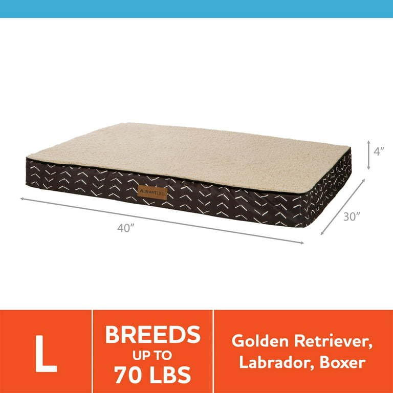 Orthopedic Bed Mattress Edition™ Pet Bed is a large deluxe dog bed with an extra thick foam cushion that provides optimal support for key pressure points and comfort for pets with achy joints. Ideal for pets of all ages, including older dogs, and for pets who like to stretch out when they rest. A comfortable pet bed for a restful sleep or a lounge area in the home, crate, or car. Designed to compliment and blend into your home with on trend colors and fabrics. Easy to clean, this bed has a removable cover that is machine-washable. If your pet is incontinent, place a protective layer between the cover and foam pad before use. Sizing: 40 inches x 30 inches x 4 inches. Ideal for large pets, up to 70 lbs. Mattress Edition™ pet beds are part of Walmart's Closed Loop Program and contain recycled human-grade mattress materials and post-consumer recycled fibers, keeping thousands of mattresses from landfills annually and providing premium full body support and comfort for pets of all ages and sizes. Purchasing Orthopedic Bed Mattress Edition™ pet bed keeps the equivalent of one hundred & twelve 16.9 oz plastic water bottles from reaching our landfills, doing our part for the environment one pet bed at a time.PROVIDES OPTIMAL SUPPORT FOR KEY PRESSURE POINTS and relieves achy joints with an extra thick foam cushion, making it an ideal pet bed for pets of all agesUSE AS A stand-alone bed or as a crate matIDEAL PET BED for dogs who prefer to stretch-out when they restCONTAINS HUMAN-GRADE recycled mattress materialsGREAT for large dogs up to 70 lbs and homes with multiple petsDESIGNED TO BLEND IN to your home-décorEASY TO CLEAN removable cover that is machine-washable, air/line-dry only