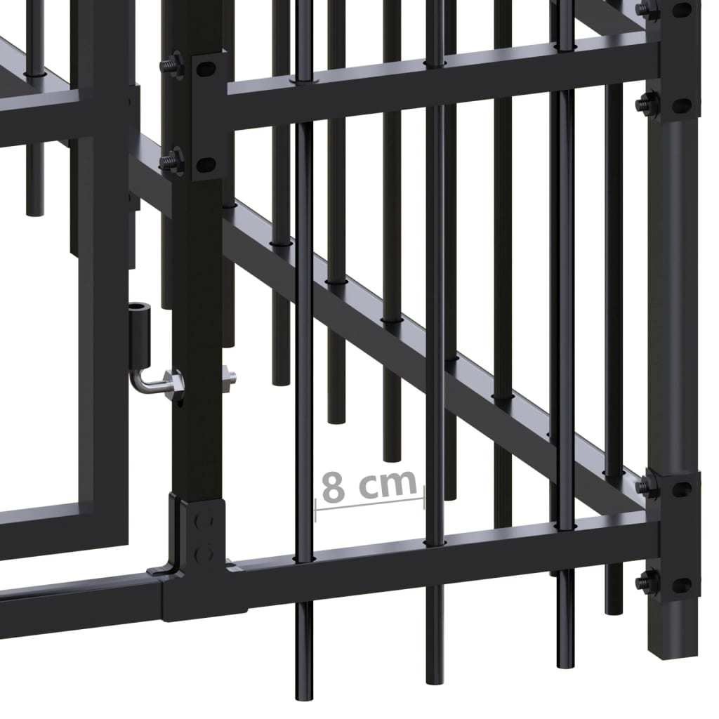 This dog kennel provides ample exercise space. The walls of steel bars help prevent mischief and unexpected accidents while enabling ventilation. Thanks to the sturdy powder-coated steel construction; this dog kennel is durable and built to last. The hinged door with a lockable latch system ensures extra security and safety for your dogs.Color: BlackMaterial: Powder-coated steelOverall dimensions: 378" x 75.6" x 78.7" (L x W x H)Door size: 19.7" x 70.9" (W x H)With doorsLockable latch systemAssembly required: Yes