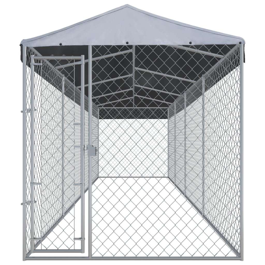 This large dog kennel provides ample exercise space while the chain link mesh all around helps prevent mischief and unexpected accidents; while enabling ventilation. Thanks to the sturdy and heavy-duty galvanized steel construction; this dog kennel is durable and built to last. The included top canopy; made of 100% polyethylene; is fire-resistant and UV protected; providing protection from sun; rain; snow and other weather conditions. The hinged door ensures extra security and safety for your dogs thanks to the lockable latch system. Assembly is really easy.Material: Galvanized steelRoof material: 100% PEOverall dimensions: 299" x 75.6" x 88.6" (L x W x H)Inner dimensions: 297.2" x 73.2" x 86.6" (L x W x H)Wall height: 176.8"Ground surface area: 157.2 ft²Lockable latch systemChain-link mesh sidewallsEasy to assembleSuitable for dogs