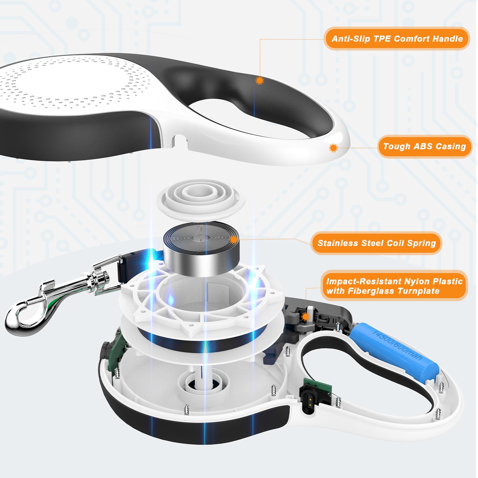 2.Tough ABS casing, Impact-Resistant nylon plastic with fiberglass,and stainless steel coil spring for reliable retraction, to retract quickly and smoothly.