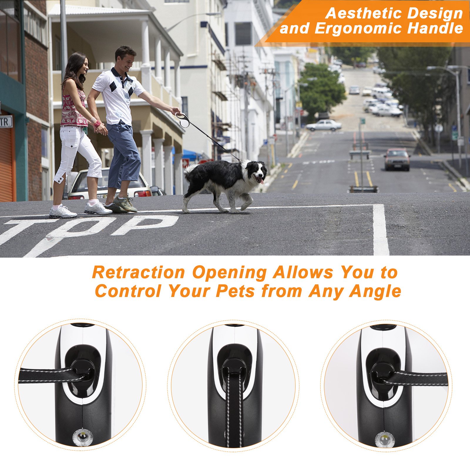 4.Aesthetic Design and Ergonomic Handle, Anti-Slip TPE handle is made of durable soft material & super comfortable grip,providing enjoyable walking experience with your pets. And the design is neat,aesthetic and ergonomic, easy to operate and you can pause, lock or release it with a single hand.